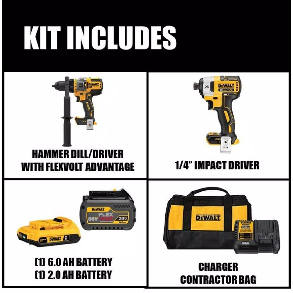 This 2-tool combo Kit features the DCD999 20V MAX* 1/2 in. Brushless Cordless Hammer Drill/Driver with FLEXVOLT ADVANTAGE tool technology. The DCD999 gets up to 42% more power** when paired with FLEXVOLT batteries. This kit comes with one DCF887 20V MAX* XR Cordless Impact driver, DCB606 FLEXVOLT Battery, 20V MAX* 2.0Ah compact battery, 6 Amp charger, and kit bag.