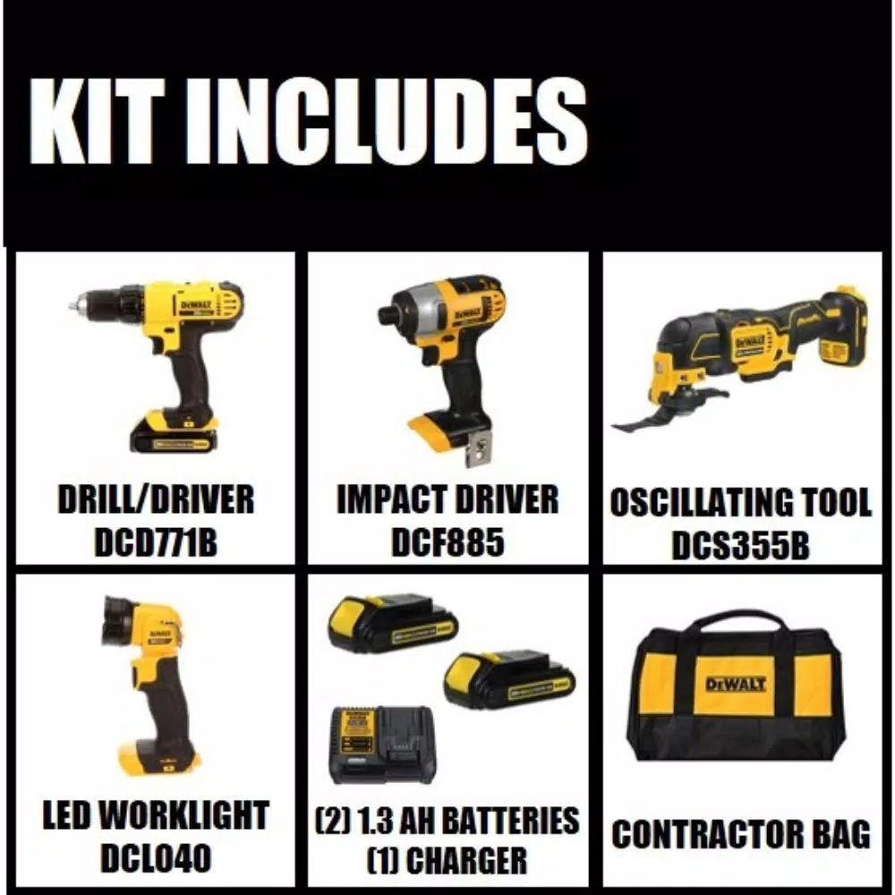 This 4-tool cordless combo kit includes one 20V MAX drill/driver, impact driver, oscillating multi-tool, LED work light, charger, two batteries, and a tool bag. The DCD771 drill/driver featurs a two-speed transmission, is lightweight and compact for working in tight spaces. The DCF885 allows for convenient one-handed loading and accepts up to 1 in. bit tips. The DCS355 oscillating multi-tool has a powerful brushless motor providing the power you need to get the job done. The DCL040 LED light helps illuminate dark work spaces and can be used hand-free.