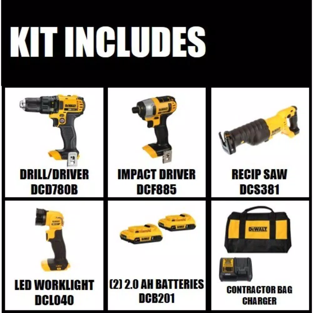- Includes DCD780 drill/driver, DCF885 impact driver, DCS381 reciprocating saw, DCL040 work light, two lithium-ion batteries, charger and contractor bag