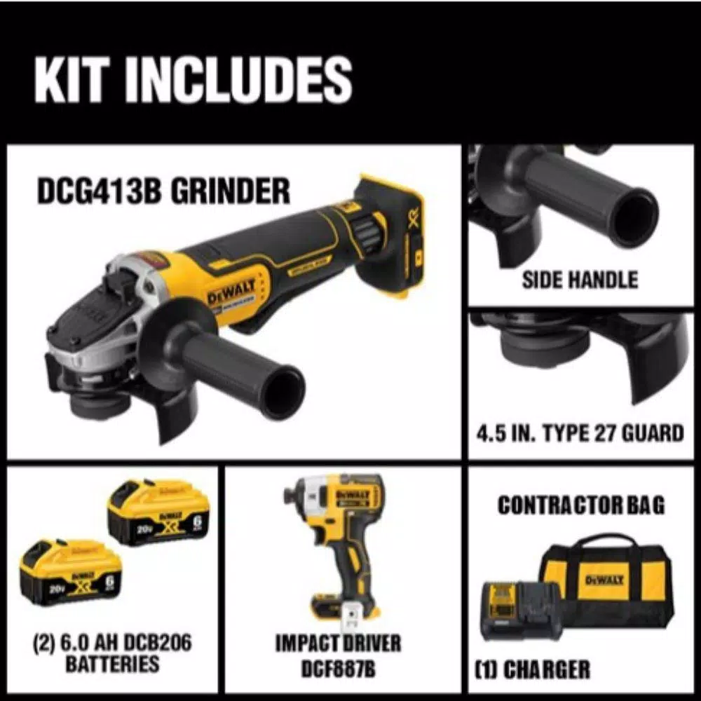 The 20-Volt MAX XR Angle Grinder features a brake, E-Clutch System, and Kickback Brake. The brake quickly brings the wheel to a stop in 2-seconds or less when the trigger is released. The E-Clutch System automatically shuts down the motor when a wheel pinch in detected. These 2-features working together to shut the tool down without user interaction, called the Kickback Brake. Additionally, the grinder features a One-Touch Guard, which allows for single-action adjustments to change guard position.