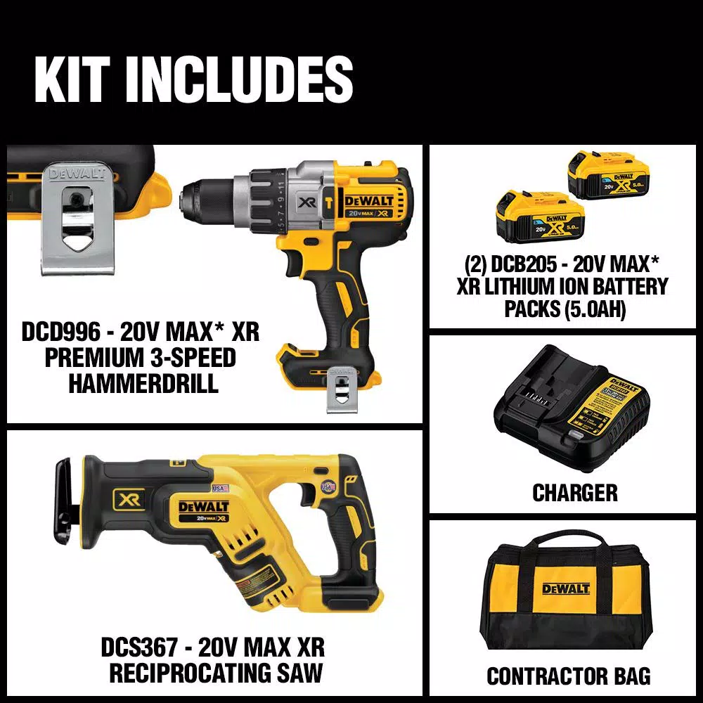 The DCK294P2 Combo kit is ideal for most drilling and cutting applications. This kit includes a brushless 1/2 in. drill and reciprocating saw. The kit also includes (2) 5.0 Ahr Batteries and a charger.