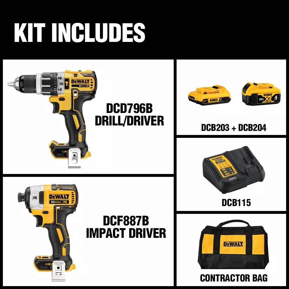 The DCK287D1M1 20-Volt MAX XR Hammer Drill/Driver/Impact Driver Power Tool Combo Kit features DEWALT built Brushless motors. Brushless motors deliver up to 57% more run time versus Brushed motors. This cordless hammer drill/impact driver set includes one 2Ah and one 4Ah Lithium Ion battery, a charger, and a contractor bag for storage. The DCK287D1M1Cordless Power Tool Combo Kit is backed by a DEWALT 3-year limited warranty for your additional peace of mind.