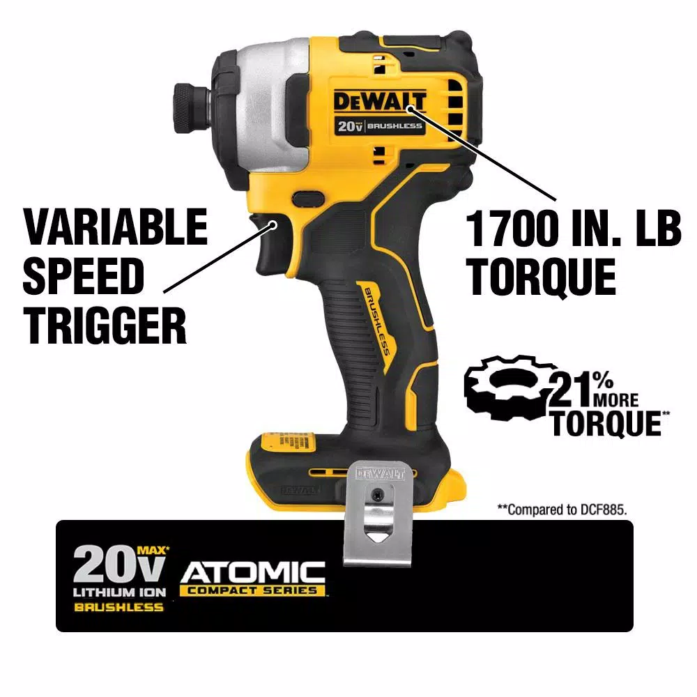 This ATOMIC Compact Seriesβ’ 20V MAX* Cordless Power Tool Combo Kit includes one 1/2 in. Cordless Drill/Driver, 1/4 in. Cordless Impact Driver, One-Handed Reciprocating Saw, Oscillating Multi-Tool, Lithium-Ion charger, kit bag, and two 20V MAX* 2.0Ah Lithium-Ion batteries. The DEWALT DCD708 Cordless Drill/Driver is compact at only 6.3 in. front to back, and its high-performance brushless motor delivers 340 unit watts out (UWO). The DEWALT DCF809 Cordless Impact Driver features a high-performance brushless motor that delivers 1,700 in-lb of max torque. The DEWALT DCS354 Oscillating Multi-Tool has a DUAL-GRIPβ’ variable-speed trigger that provides increased speed and application control. The DEWALT DCS369 One-Handed Reciprocating Saw is lightweight at only 3.13 lbs., making it 37% lighter than the DEWALT DCS367 Compact Reciprocating Saw (Tool Only). This cordless power tool set from the ATOMIC Compact Series packs more power into smaller, more comfortable tools. This helps you get into tight areas more easily and makes your DIY projects go much smoother.