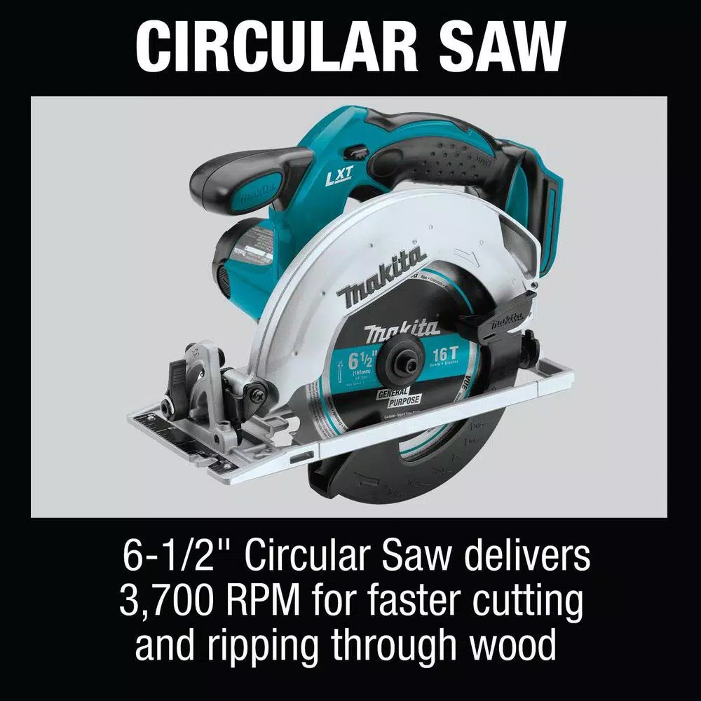 - Includes: 18V LXT 6-1/2 in. Lightweight Circular Saw (XSS02Z); 18V LXT Variable Speed Compact Reciprocating Saw (XRJ01Z); 18V LXT Handheld Vacuum (XLC02ZB); 18V 1/2 in. Driver-Drill (XFD10Z); 18V 1/4 in. Impact Driver (XDT11Z); 18V LXT LED Flashlight (DML815); 18V LXT Lithium-Ion 3.0Ah Battery (BL1830B); Battery Charger (DC18SD)