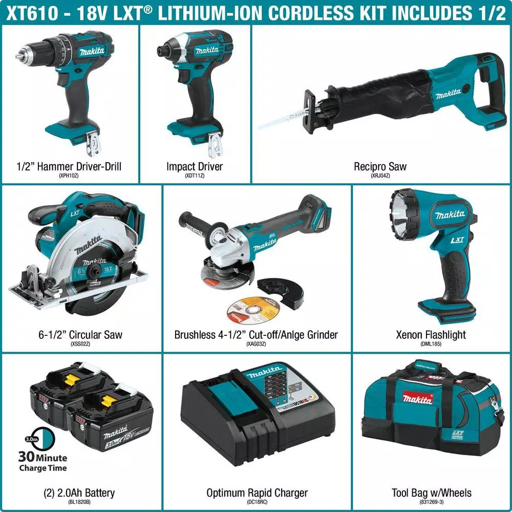 - Includes: 18V LXT 6-1/2 in. Lightweight Circular Saw (XSS02Z); 18V LXT Reciprocating Saw (XRJ04Z); 18V LXT 1/2 in. Hammer Driver-Drill (XPH10Z); 18V LXT 1/4 in. Impact Driver (XDT11Z); 18V LXT 4-1/2 in. Cut-Off/Angle Grinder (XAG03Z); 18V LXT Xenon Flashlight (DML185); 18V LXT Rapid Optimum Battery Charger (DC18RC); 18V LXT Lithium-Ion 3.0Ah Battery (BL1830B); Tool Bag with Wheels (831269-3)
