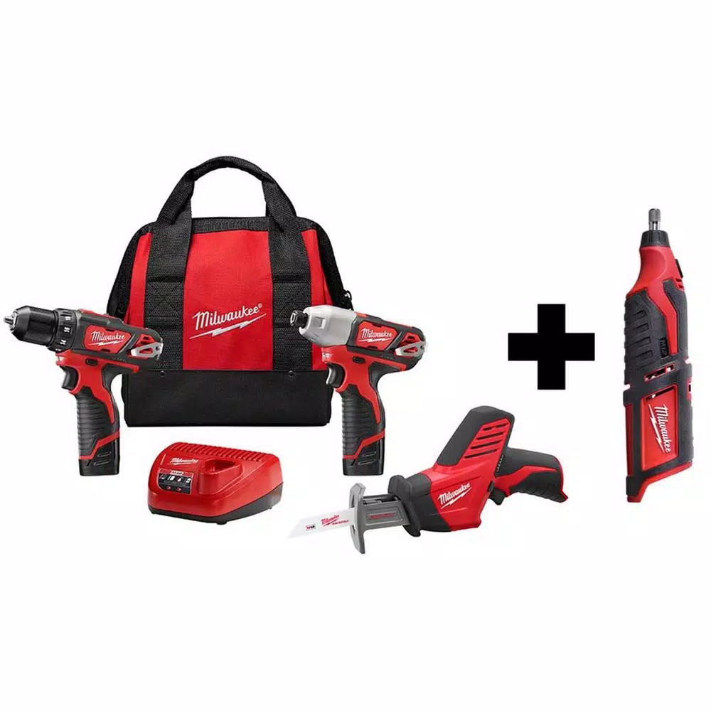 - Includes: 2407-20 M12 3/8 in. drill/driver, 2462-20 M12 1/4 in. hex impact driver, 2420-20 M12 HACKZALL recip. saw, 2 48-11-2401 M12 REDLITHIUM batteries, 48-59-2401 M12 30-minute charger and a contractor bag, M12 rotary tool (2460-20)