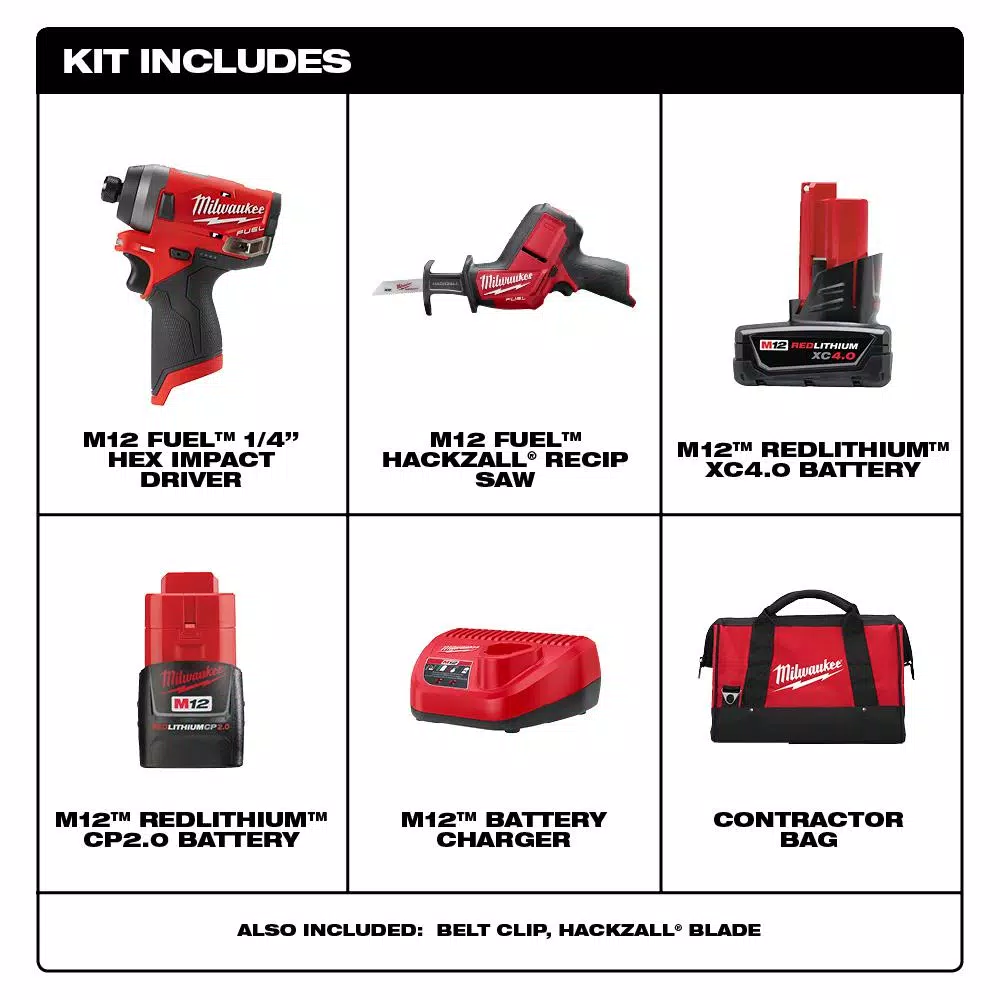 - Includes: (1) M12 FUELโข Impact Driver (2553-20), (1) M12 FUELโข Hackzall (2520-20), (1) M12โข XC 4.0Ah Battery (48-11-2440), (1) M12โข CP 2.0Ah Battery (48-11-2420), (1) M12โข Charger (48-59-2401), (1) Hackzall Blade (50-01-1412), (1) Contractor Bag (42-55-2520)