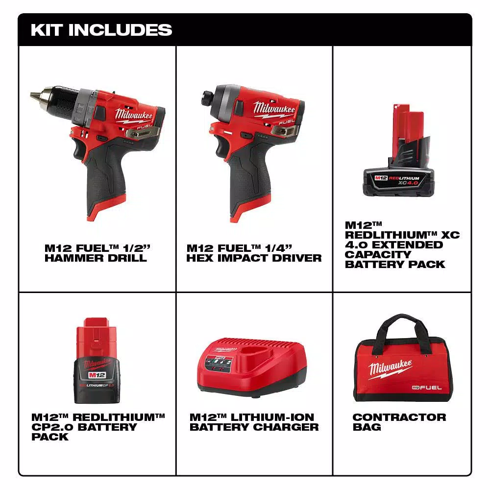 - Includes: 2504-20 1/2 in. hammer drill driver, 2553-20 1/4 in. hex impact driver, M12 REDLITHIUM 2.0 compact battery pack, M12 REDLITHIUM XC 4.0 extended capacity battery pack, charger, 2 belt clips, and contractor bag