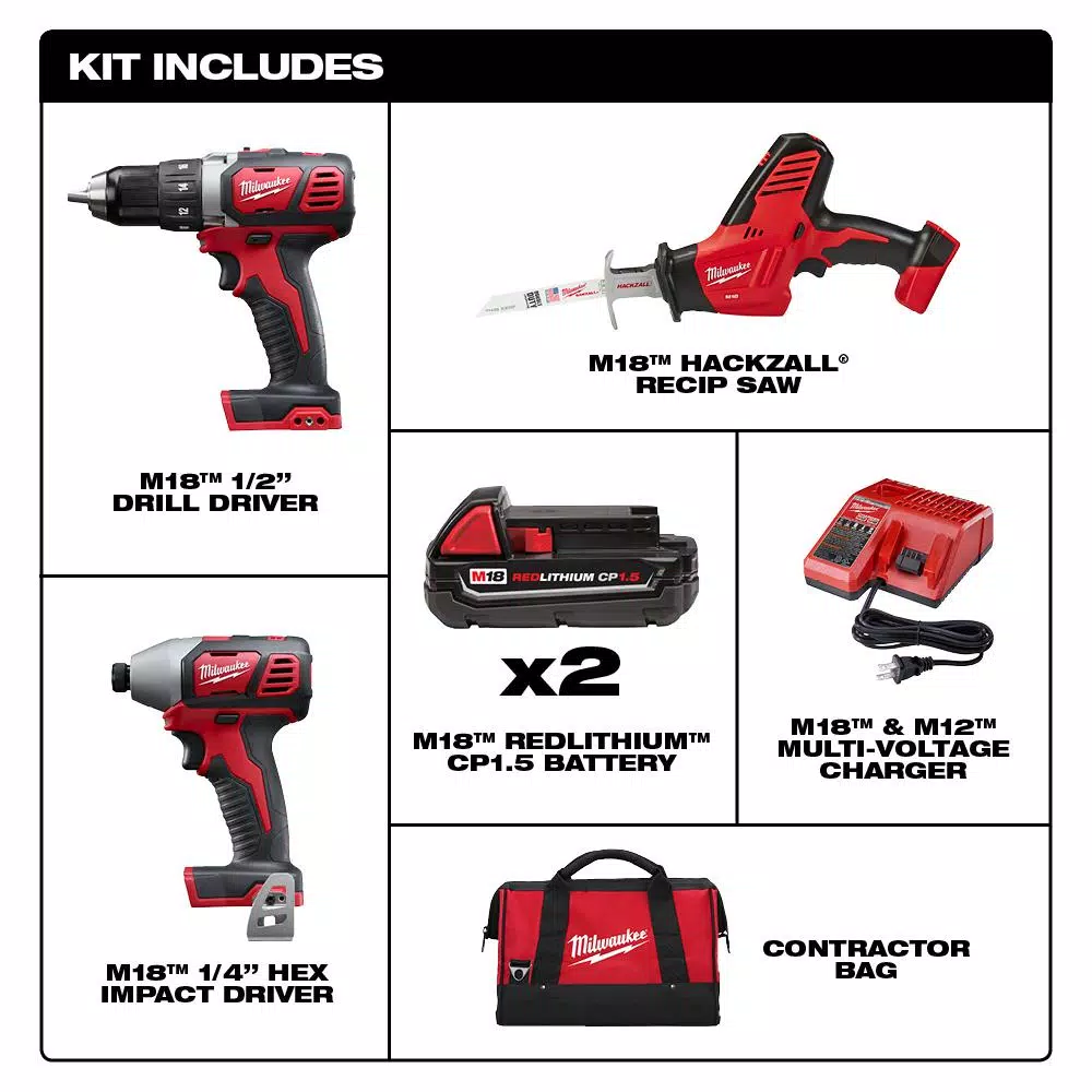 - Includes: (1) M18 1/2 drill driver (2606-20), (1) M18 1/4 hex impact driver (2656-20), (1) M18 HACKZALL recip saw (2625-20), (2) CP battery (48-11-1815), (1) M18 and M12 charger (48-59-1812)