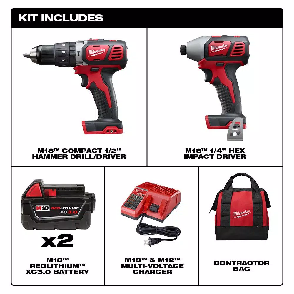- Includes: one M18 compact 1/2 in. hammer drill/driver (2607-20), one 2656-20 M18 1/4 in. hex compact impact driver, two M18 XC REDLITHIUM 3.0 Ah battery (48-11-1828), one 48-59-1812 M18/M12 multi-voltage charger, one tool bag