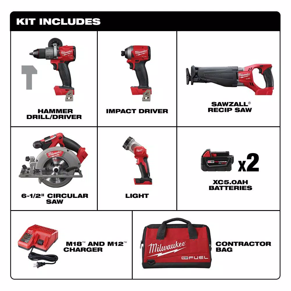 - Includes: M18 FUEL 1/2″ Hammer Drill (2804-20), M18 FUEL 1/4″ Hex Impact Driver (2853-20), M18 FUEL SAWZALL® Reciprocating Saw (2720-20), M18 FUEL 6-1/2″ Circular Saw (2730-20), M18 LED Work Light (2735-20), (2) M18 REDLITHIUM XC5.0 Battery, (1) M18 & M12 Multi-Voltage Charger, (1) 6″ 18 TPI Thin-Kerf Blade, (1) Circular Saw Blade, (2) Belt Clips, (2) Bit Holders, (1) Contractor Bag