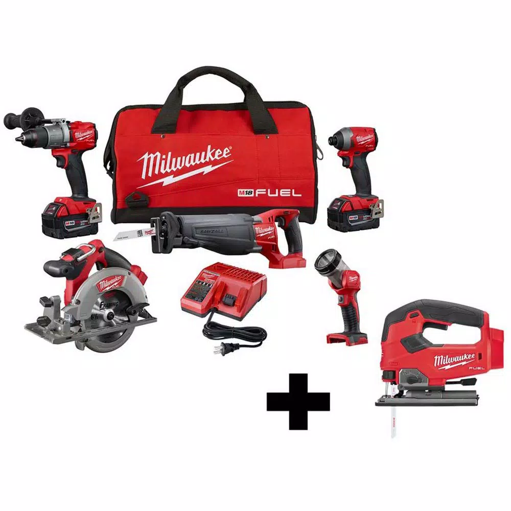 - Includes: M18 FUEL 1/2 in. hammer drill (2804-20), M18 FUEL 1/4 in. hex impact driver (2853-20), M18 FUEL SAWZALL reciprocating saw (2720-20), M18 FUEL 6-1/2 in. circular saw (2730-20), M18 LED work light (2735-20), two M18 REDLITHIUM XC5.0 battery, one M18 and M12 multi-voltage charger, one 6 in. 18 TPI thin-kerf blade, 1 circular saw blade, 2 belt clips, 2 bit holders, 1 contractor bag, 1 2737-20 M18 FUEL jig saw (tool-only)