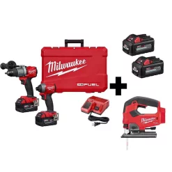 - Includes: (1) M18 FUEL 1/2 in. hammer drill (2804-20), (1) M18 FUEL 1/4 in. hex impact driver (2853-20), (2) M18 REDLITHIUM XC5.0 Battery, (1) M18 and M12 multi-voltage charger, (1) side handle, (2) belt clip, (2) bit holder, (1) carrying case, (1) M18 FUEL D-handle jig saw (2737-20), (1) anti-splinter guard, (1) dust collection tube, (1) dust cover, (1) general purpose jigsaw blade, (1) hex wrench, (1) shoe guard, (2) M18 REDLITHIUM HIGH OUTPUT XC 6.0 Ah battery packs