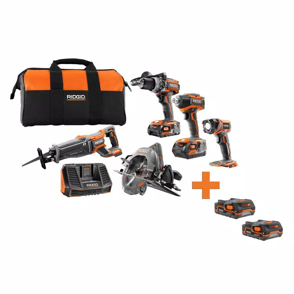 - Includes: (1) R86116 Brushless Hammer Drill/Driver, (1) R86038 Impact Driver, (1) R8643 Reciprocating Saw, (1) R8653 Circular Saw, (1) R8693 LED Worklight, (1) R840086 2.0 Ah Battery, (1) R840087 4.0 Ah Battery, (1) R840095 18-Volt Charger, (1) Contractorโs Bag, bits and blades, Bonus (2) R840085 1.5 Ah Compact Lithium-Ion Batteries and operatorโs manuals