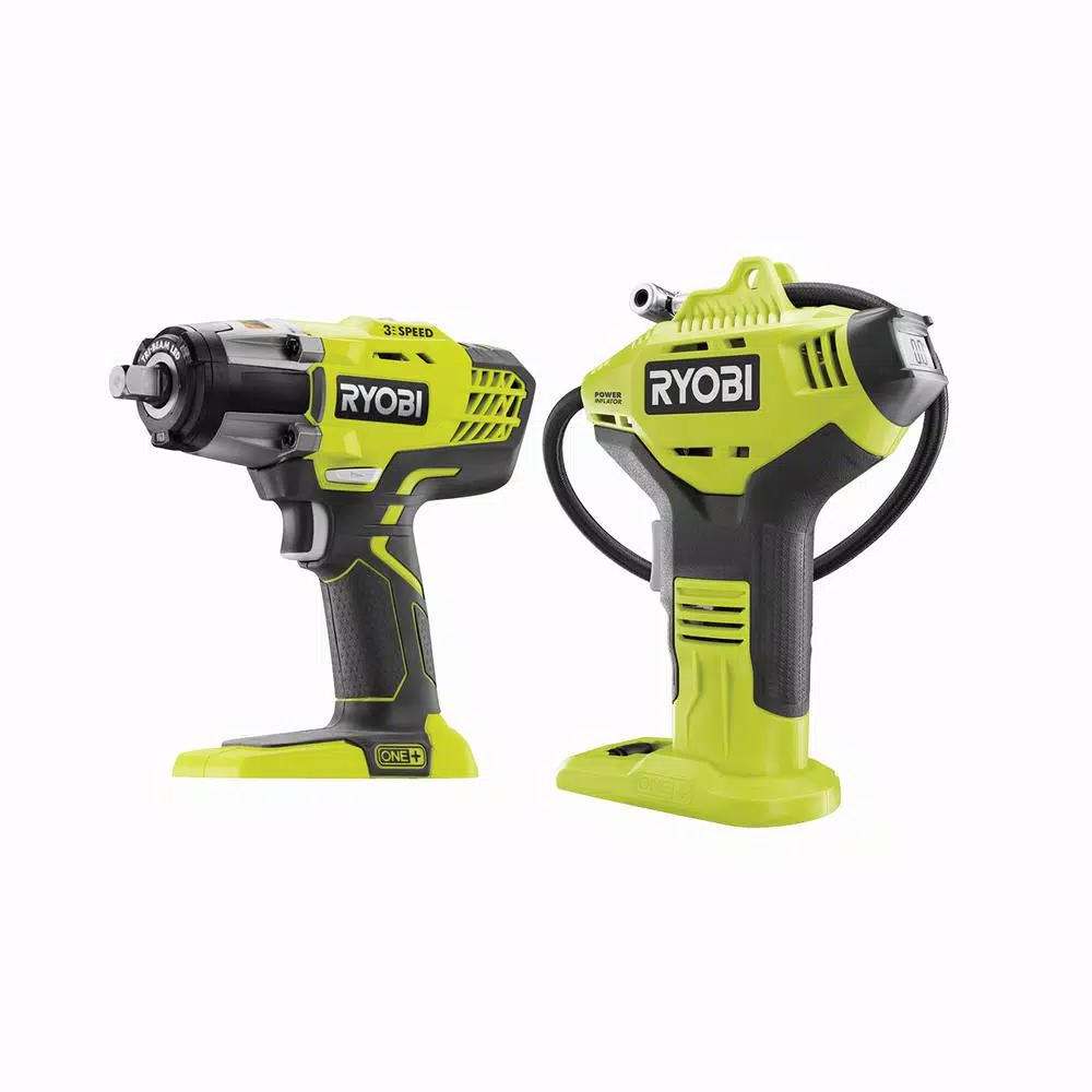 RYOBI introduces the 18V ONE+ Cordless 1/2 in. Impact Wrench and Power Inflator Kit (Tools Only). The 3-Speed 1/2 in. Impact Wrench is more compact and more powerful than the ever before. With this new design, it produces 300 ft./lbs. of torque and up to 3,200 impacts per minute (IPM) allowing you to use this tool for a variety of heavy duty applications. This tool features a 3-speed selector switch and tri-beam LED lights. The Cordless Power Inflator is the perfect tool for tires and small inflatables ranging from 0 PSI to 150 PSI. It features an easy to read digital gauge that provides pin point accuracy. The cordless convenience allows for use in virtually any location, such as tight spaces or corners, high pressure applications such as sports balls or in the driveway. Best of all, it is part of the RYOBI ONE+ System of over 125 cordless tools that all work on the same battery platform. Backed by the RYOBI 3-Year Manufacturerβs Warranty, the 18V ONE+ 2-Tool Combo Kit includes a 3-Speed 1/2 in. Impact Wrench, a Cordless Power Inflator with a hose, sports needle, and high pressure nozzles, and operatorβs manuals. Batteries and chargers are sold separately.
