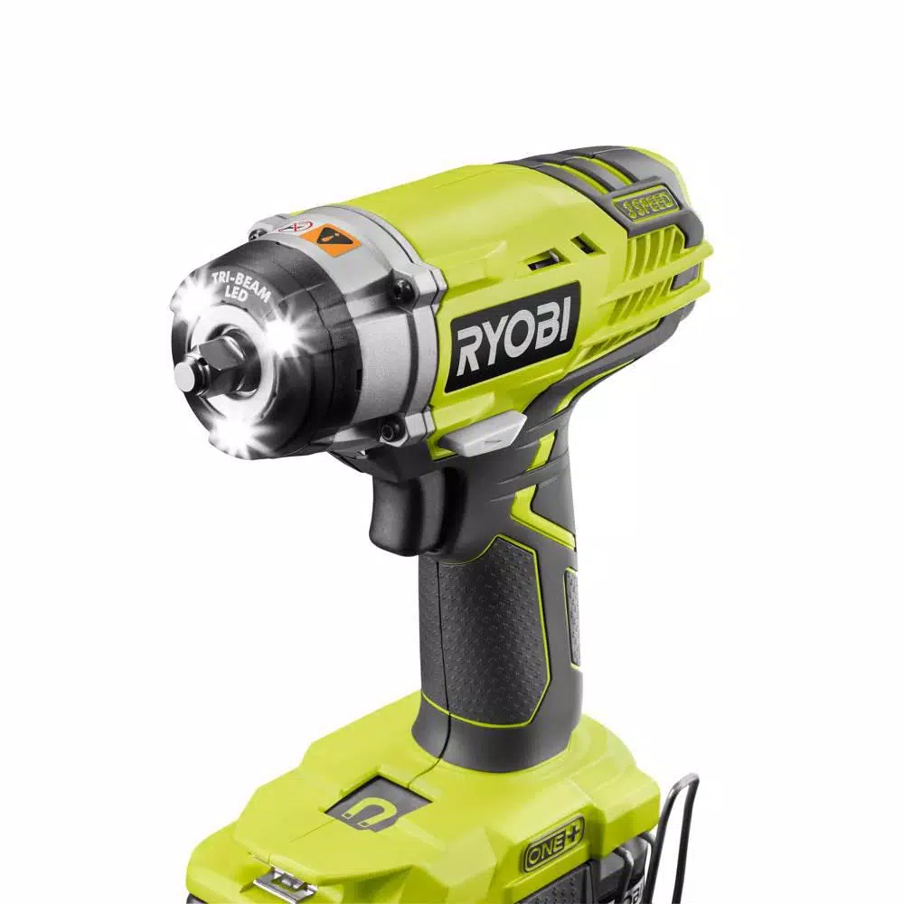 RYOBI introduces the 18V ONE+ Lithium-Ion Cordless 3/8 in. 3-Speed Impact Wrench and 3/8 in. 4-Position Ratchet Kit (Tools Only). This 3/8 in. Impact Wrench is compact and powerful. It produces 150 ft./lbs. of torque and up to 3,400 impacts per minute allowing you to use this tool for a variety of automotive applications. This tool features a 3-speed selector switch and tri-beam LED lights for work space visibility. The 3/8 in. size is common and works with most sockets. The 18V ONE+ 3/8 in. 4-Position Ratchet produces up to 35 ft./lbs. of torque for heavy duty fastening applications and 230 RPMs to drive and remove fasteners. The ONE+ Cordless 3/8 in. 4-Position Ratchet is great for a variety of fastening applications, from working on your engine to removing your lawn mower blade. The 4-position head makes fitting into tight spaces a breeze at any angle. Regardless of what angle you position the ratchet, your workspace will be lit by one of the two LED’s on the front of the ratchet. Best of all, it is part of the RYOBI ONE+ System of over 175 cordless tools that all work on the same battery platform. Backed by the RYOBI 3-Year Manufacturer’s Warranty, the 18V ONE+ Cordless 3/8 in. 3-Speed Impact Wrench and 3/8 in. 4-Position Ratchet Kit (Tools Only) includes an 18V ONE+ Cordless 3/8 in. 3-Speed Impact Wrench with a belt clip, an 18V ONE+ Cordless 3/8 in. 4-Position Ratchet, and operator’s manuals. Battery and charger sold separately.