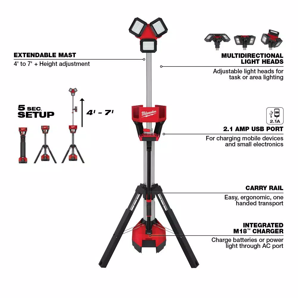 The MILWAUKEE® M18™ ROCKET™ Tower Light/Charger is designed to deliver users a lighting solution that adapts, performs, and survives to the jobsite This light tower sets up in seconds to a max height of 7’ and collapses to less than 4’ for easy transportation and storage. The LED light head can be extended from 4-7’ to light overhead work or minimize shadows when casting shine downward. The multidirectional light head allows users to orient the three independently pivoting light heads to cast light in several directions. With an integrated AC plug, users can plug in the light with a standard extension cord and charge any M18™ REDLITHIUM™ pack or use the USB port to charge your devices on site. Delivering 6,000 lumens, it fills up large areas with TRUEVIEW™ High Definition light. For optimized control over the output and run-time, the M18™ ROCKET™ LED Light has three output settings. The LEDs never need to be replaced and are backed by a limited lifetime warranty. Milwaukee ROCKET™ Tower Lights are designed to deploy in seconds and built to adapt to any job site environment. The LED light towers supply both task and area lighting as well as provide light overhead to reduce shadows in the workspace.