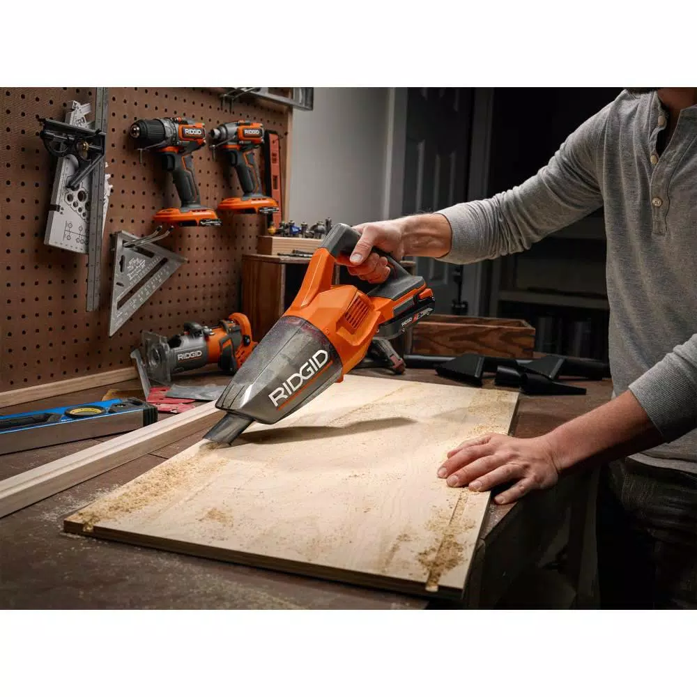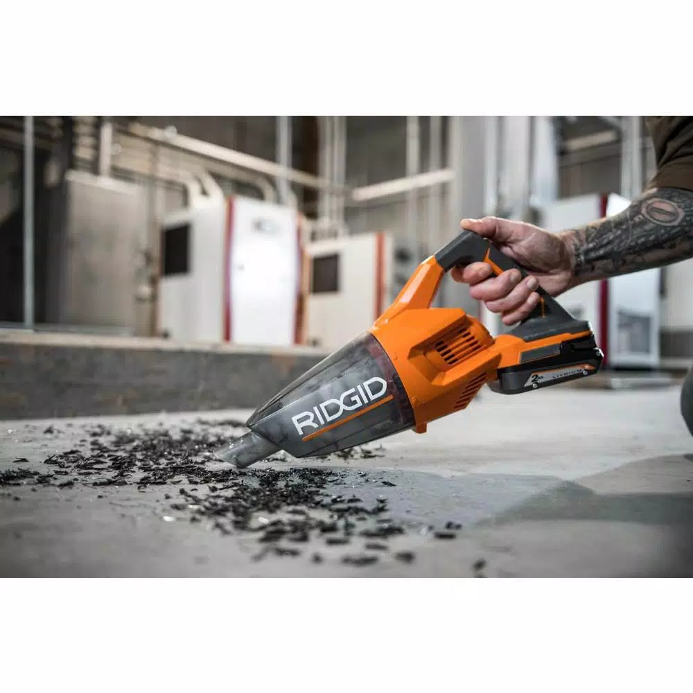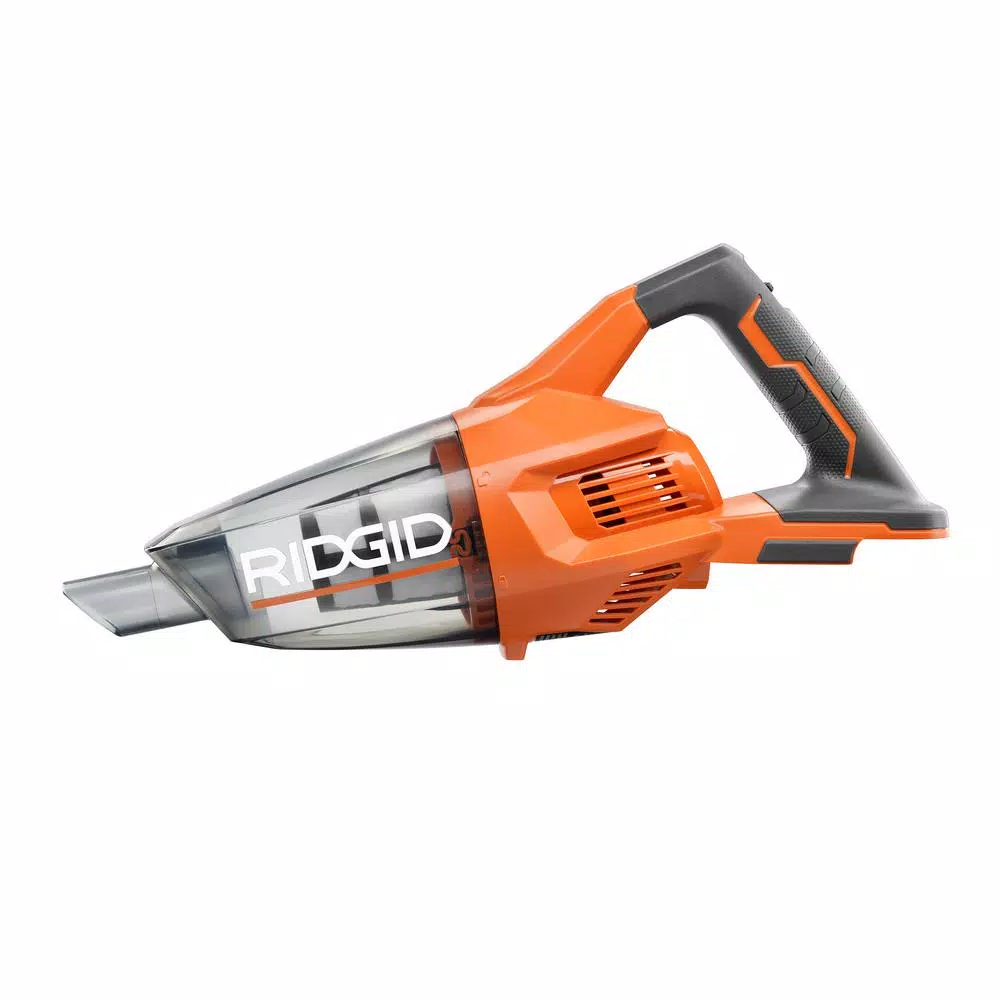 RIDGID introduces the 18-Volt Compact Hand Vacuum. This Compact Hand Vacuum provides superior suction in a compact design for user convenience. It weighs 3.06 pounds, helping prevent user fatigue during operation, and has a transparent tank with a two-motion detachable tank for quick and easy cleaning. This tool is backed by the Industryβs Only Lifetime Service Agreement, simply register within 90 days of purchase for FREE Parts, FREE Service, For LIFE. The 18-Volt Cordless Vacuum (Tool-Only) with Crevice Nozzle, Utility Nozzle and Extension Tube includes an extension tube, a crevice nozzle, a crevice clip, a floor nozzle, and an operatorβs manual. Battery and charger sold separately