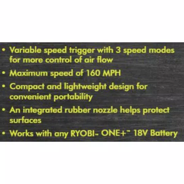 RYOBI introduces the 18-Volt ONE+ Cordless Compact Workshop Blower (Tool Only). This compact and lightweight blower is ideal for cleaning up your workshop after a DIY job and professional jobsite areas. With a maximum air speed up to 160 MPH you can blow away dust and other messes in a flash. This workshop blower also features a variable speed trigger with 3-speed settings so you can adjust the speed to your needs. Best of all, it is part of the RYOBI ONE+ System of over 175 Cordless Tools that all work on the same battery platform. Backed by the RYOBI 3-Year Manufacturerโs Warranty, the 18-Volt ONE+ Compact Workshop Blower includes an operatorโs manual. Battery and charger sold separately.